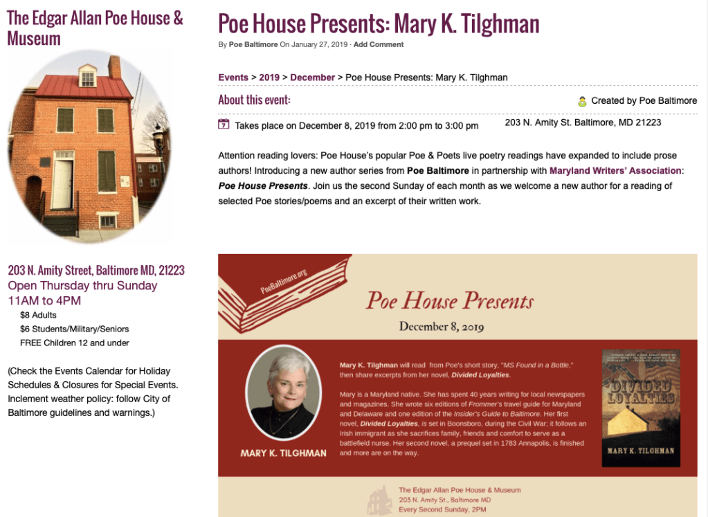 First up, Sunday, Dec. 8, at 2 p.m., I am the featured reader at the Poe House and Museum‘s monthly Authors Series. I will be reading from Mr. Poe’s “MS. Found in a Bottle.” I chose this story because he wrote this in the house on Amity Street and it the winner of the Baltimore Saturday Visiter [sic] writing competition in 1833. He won $50 and his career was launched. The committee choosing his story said, “It will be found highly graphic in its style of composition.