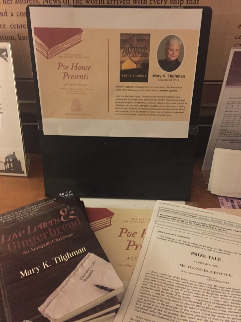 Yesterday I was fortunate enough to read Edgar Allan Poe’s “MS. Found in a Bottle,” a short story he wrote while living in the West Baltimore house. It’s said this story of a storm-tossed ship launched Mr. Poe’s career as a weaver of strange and eerie tales.