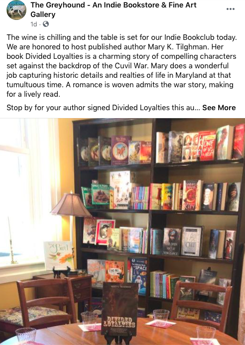 The bookstore is filled with best sellers and the works of local writers. I’m thrilled to say that my books are not only on their shelves but one of their three book clubs has been reading Divided Loyalties and Love Letters & Gingerbread.