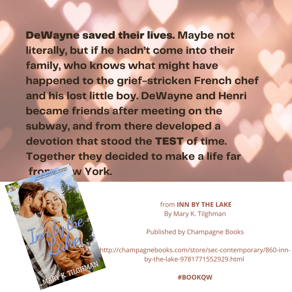 DeWayne and Henri are the stepfather and father of my book’s main character Luke. Together, they run the Inn by Deep Creek Lake in Western Maryland. Usually a well-suited pair, they are at odds over the inn’s future.