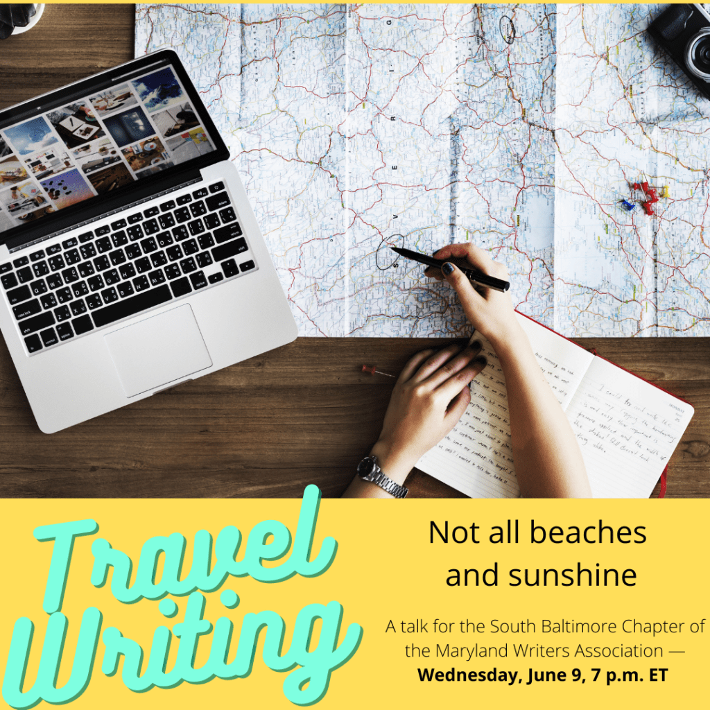 On Wednesday night, at 7 p.m Eastern time, I’m going to talk about my past life for the South Baltimore writers of the Maryland Writers Association. In a talk entitled From Here to There Travel Writing Isn’t All Beaches and Sunshine, I’ll talk about how my travel writing career for Frommer’s went. I wrote six travel guides for them, starting in 2001. All my guides were written about Maryland and Delaware–no exotic Tahiti or romantic Paris for me.