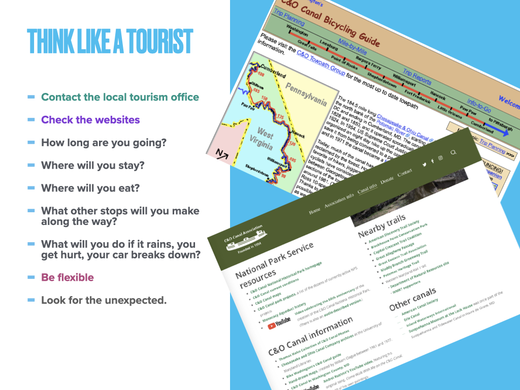 Check the websites. I live by Google maps as an aid for everything I need when I’m getting ready to travel. I want to know how far it is from the highway to the parking lot, what’s in the area I might want to see, sometimes whether I want to stop at all. Then read the tourism sites and the special interest sites. The C&O Canal for instance has national park service sites and local cycling aficionado sites.