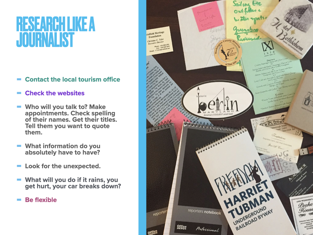 - Then research like a journalist. Take plenty of notes. Bring all the notebooks and pens you can carry as well as your phone and your laptop, and a tote bag for everything you want to bring home.