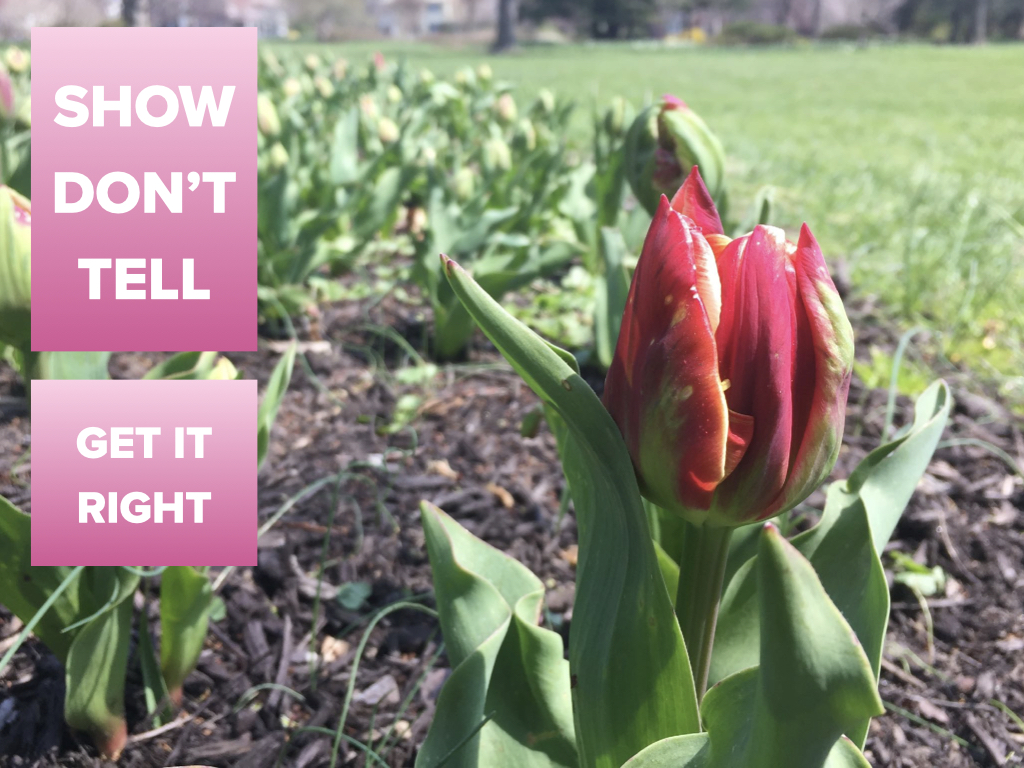When you write, show don’t tell. You know Sherwood Gardens is beautiful in the spring. Don’t say that. Show it. Describe the beds bursting with red-flamed tulips. Show the parents with little children gamboling under the blooming magnolias. Smell the floral-scented breeze cooling your face on an unseasonably hot Sunday afternoon. Then check when the flowers actually bloom and where the heck do you park anyway. And can you bring your dog? Or a picnic lunch? Or hold a wedding on the property?