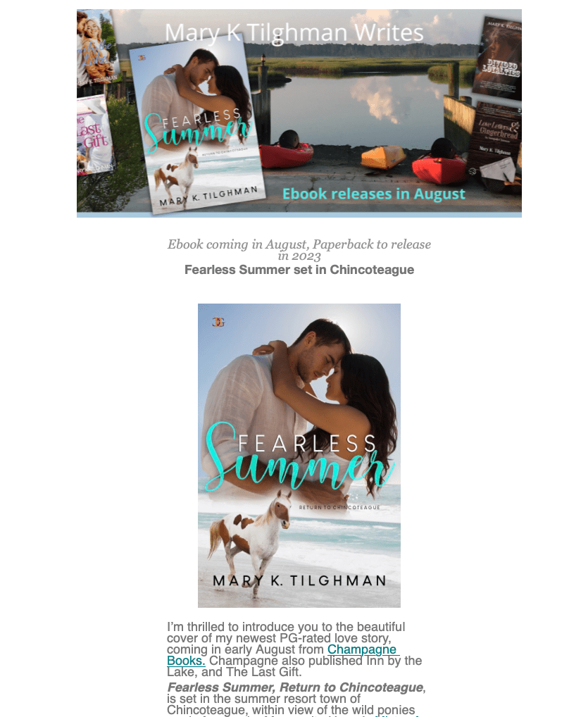 I send out my newsletter only occasionally and pack it with all the latest about my books, appearances and other book-related news. With a few projects in the works I’ll probably send out a fall newsletter, followed by a winter newsletter when I have dates for the launch of FEARLESS SUMMER, the paperback edition and for the release of STEP INTO THE SUNLIGHT, my sibling rivalry romance set in Ocean City, Md.